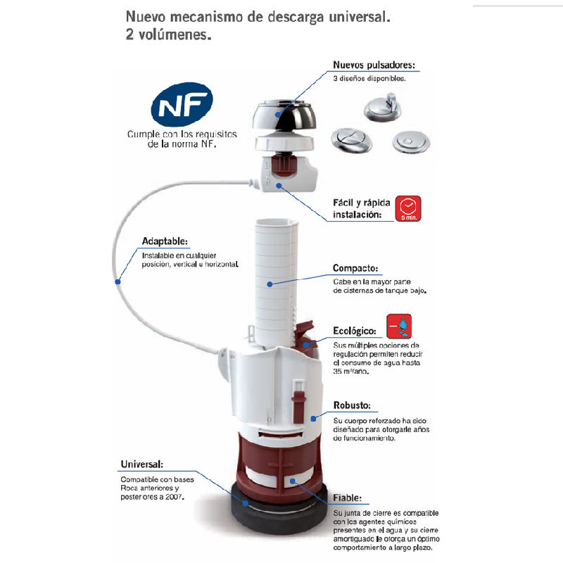Una evolución del mecanismo de descarga original que permite, con un solo modelo, la instalación en inodoros provistos con base roscada (modelos Roca anteriores a 2007) o con enchufe rápido (modelos posteriores a 2007).